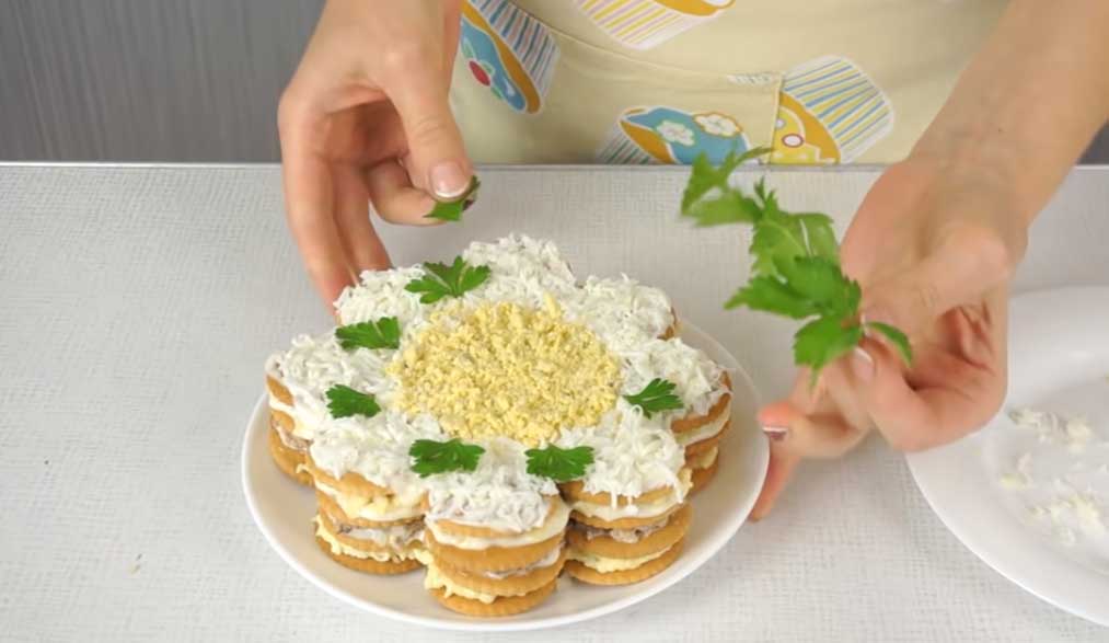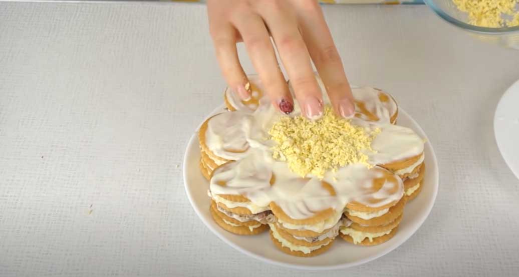 Знову шар крекерів, майонез і врешті приступайте до прикрашання закускового торта. Для цього натріть по окремо білок та жовток із яйця, яке ми відклали. Серединку квіточки з крекерів, що утворилася, просипте натертим жовтком. По краях викладіть білок.