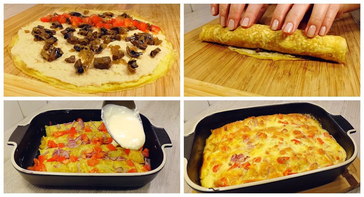 - Загорніть млинці у щільні рулети та викладіть у форму для запікання. Зверху по них розкладіть порізану напівкільцями червону цибулю, решту помідорів та залийте заливкою. Заливку приготуйте, змішавши сметану, сир та яйце до однорідної маси.