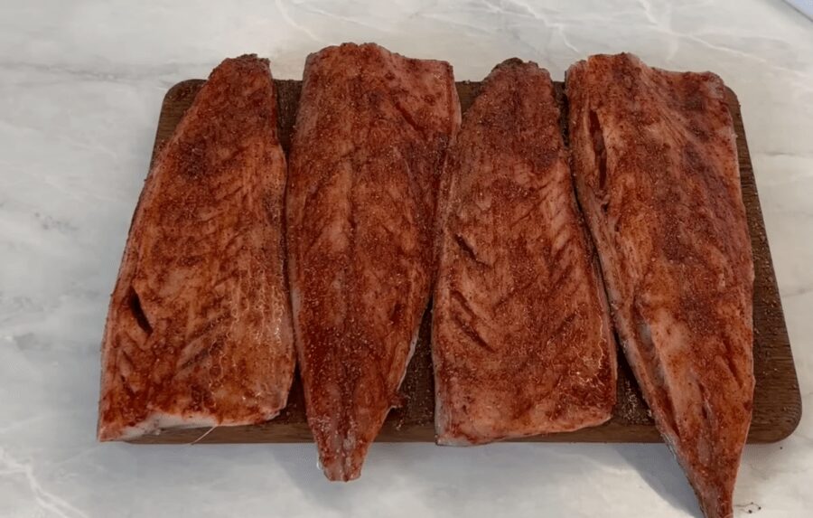 Свіжоморожену скумбрію потрібно почистити і добре промити. Робимо це, коли рибка ще трохи підморожена. Відрізаємо голову, хвіст, розрізаємо животик і видаляємо всі нутрощі. Промиваємо рибу, прибираємо чорні плівки і просушуємо паперовим рушником. Зрізаємо у риби плавники і розділяємо на філе, прибравши хребет. З філе видаляємо всі кісточки. Підготовлену рибку солимо, перчимо, додаємо червону паприку і змащуємо олією.