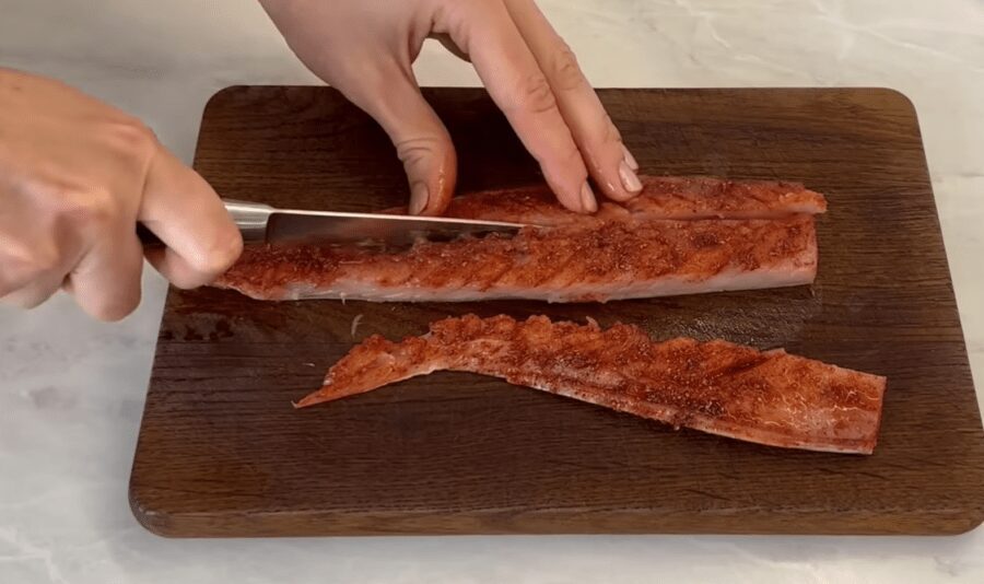Залишаємо філе маринуватися на 30 хвилин. Після цього кожне філе розрізаємо вздовж на 3 частини.