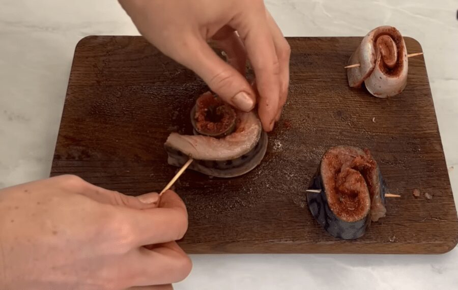 Кожну рибну смужечку закручуємо у рулетик. Крутити починаємо з хвоста. Скріпляємо рулетики зубочистками.