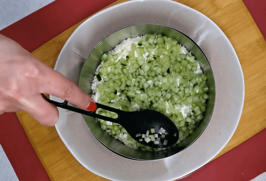 Сирний шар змащуємо майонезом. Огірки нарізаємо дрібним кубиком і викладаємо наступним шаром на салат. Використовуємо половину зазначених у рецепті огірків. Цей шар злегка присолюємо і робимо сіточку з майонезу.