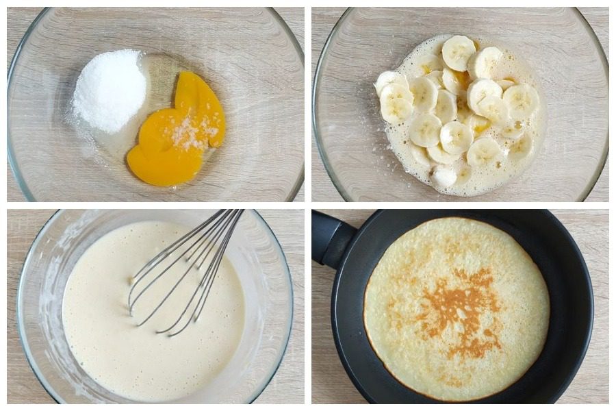 - Додайте до бананово-яєчної суміші молоко кімнатної температури та перемішайте. Потім додайте просіяне борошно і знову перемішайте до однорідності. Тісто повинно бути рідким, як для класичних млинців. Якщо воно виходить густим, то потрібно додати трохи молока, а якщо рідким – додайте борошно. Залиште тісто на 15 хвилин.
