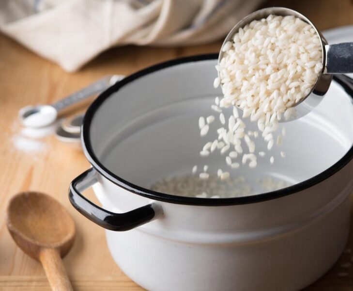 Перш ніж починати приготування рису, промийте крупу у холодній воді. Найкращий варіант – залишити рис у прохолодній воді на декілька годин, а потім два-три рази промити його. Так ви точно видалите зайвий крохмаль, що й допоможе зварити розсипчастий рис. Далі потрібно висипати рис у каструлю, в якій будете готувати кашу та налити потрібну кількість води. Найкраща пропорція – 1:2.