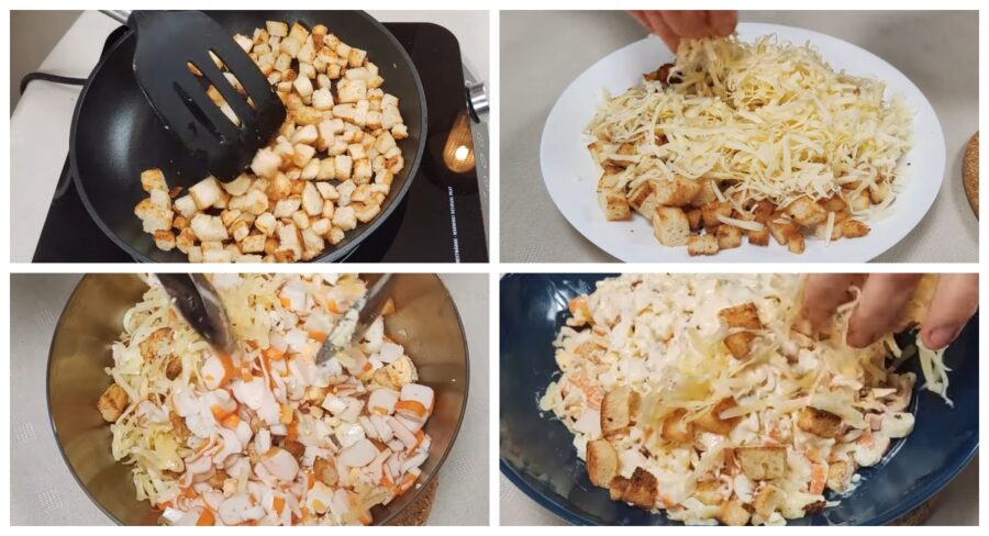 - Гарячі сухарики перекладіть на тарілку. Невелику кількість їх відкладіть для кінцевого посипання салату. А решту посипте натертим на великій терці сиром. Таким чином сир трохи розплавиться.