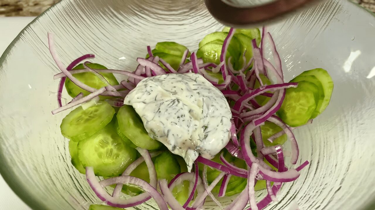 - Потім поєднайте у мисці огірки з цибулею. Заправте його соусом та перекладіть салат на сервірувальне блюдо.