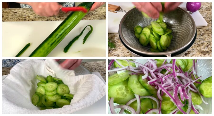 - Почніть приготування з огірка. Відчистить огірок від шкірки, а потім поріжте тоненькими кружечками. Складіть все у сито. Посоліть їх та відставте сито на піддон. Огірки повинні протягом 15-20 хвилин випустити сік.