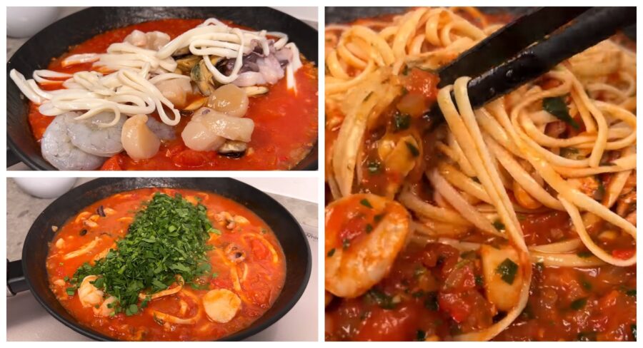 - Далі викладіть у сковорідку заморожені морепродукти. Перемішайте та продовжуйте готувати на слабкому вогні 5 хвилин. Якщо ви помітите, що маса загусла, то можете додати трохи води, у якій вариться паста.