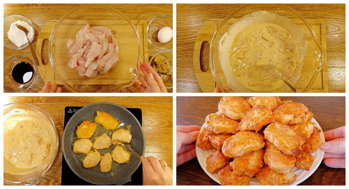 Страва виходить ароматною, але подавати її можна з будь-яким вашим улюбленим соусом, кетчупом чи сметаною. Гарніром можуть бути картопля, картопляне пюре, гречана або рисова каша й таке інше. Дуже важливо куряче філе промаринувати, тому дотримуйтесь рекомендацій рецепта. Завдяки цьому не потрібно буде довго смажити її у сковорідці. Достатньо робити це до утворення рум’яної скоринки з усіх боків шматочків. Рослинної олії також не потрібно багато. Це не є смаженням у фритюрі.