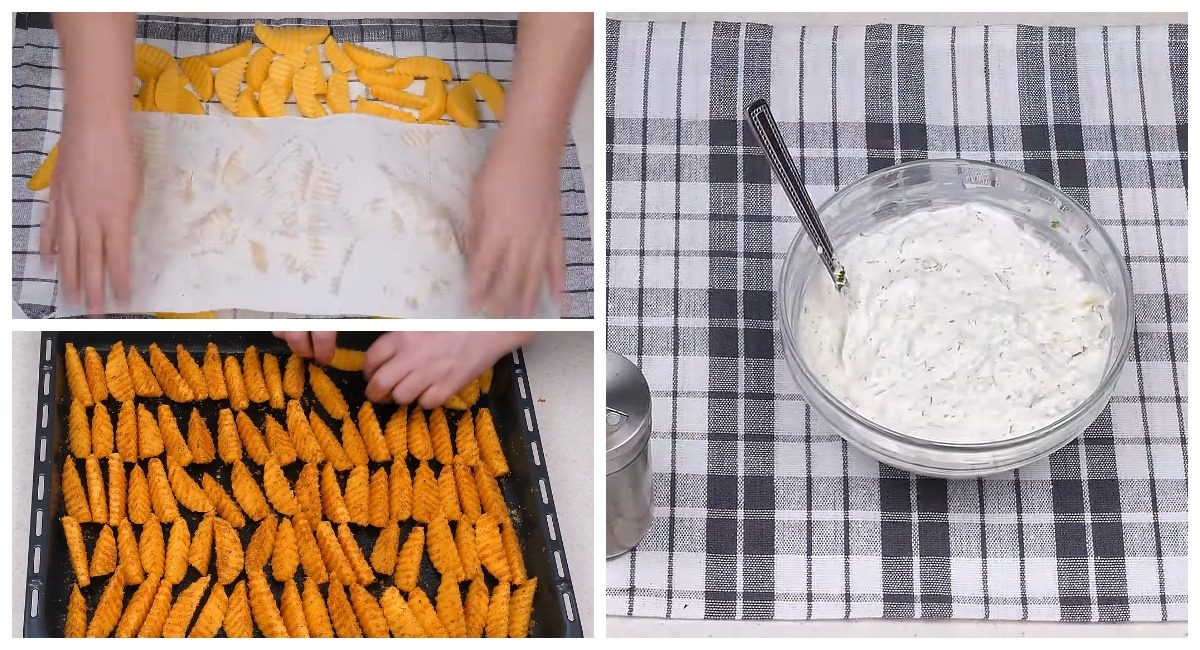 - Почищену картоплю поріжте звичайним, а краще — рифленим ножем на скибочки десь на 1/8 частини. Промийте її під проточною водою, а потім обсушіть паперовим або лляним рушником. Якщо ви не впевнені, що картопля готується швидко, то краще залийте її окропом на 15 хвилин, після чого зцідіть воду й також обсушіть за допомогою рушника.