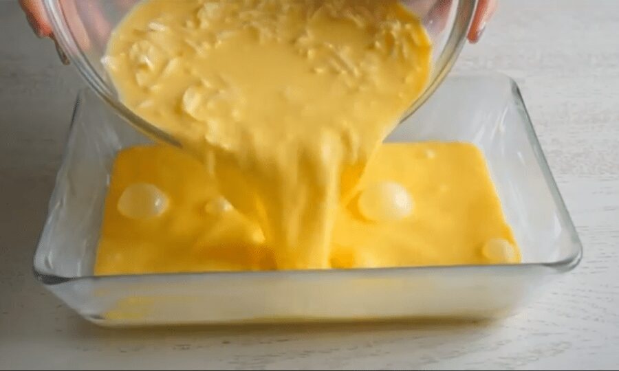 Форму для випікання змащуємо вершковим маслом (дно та стінки) і переливаємо омлет.
