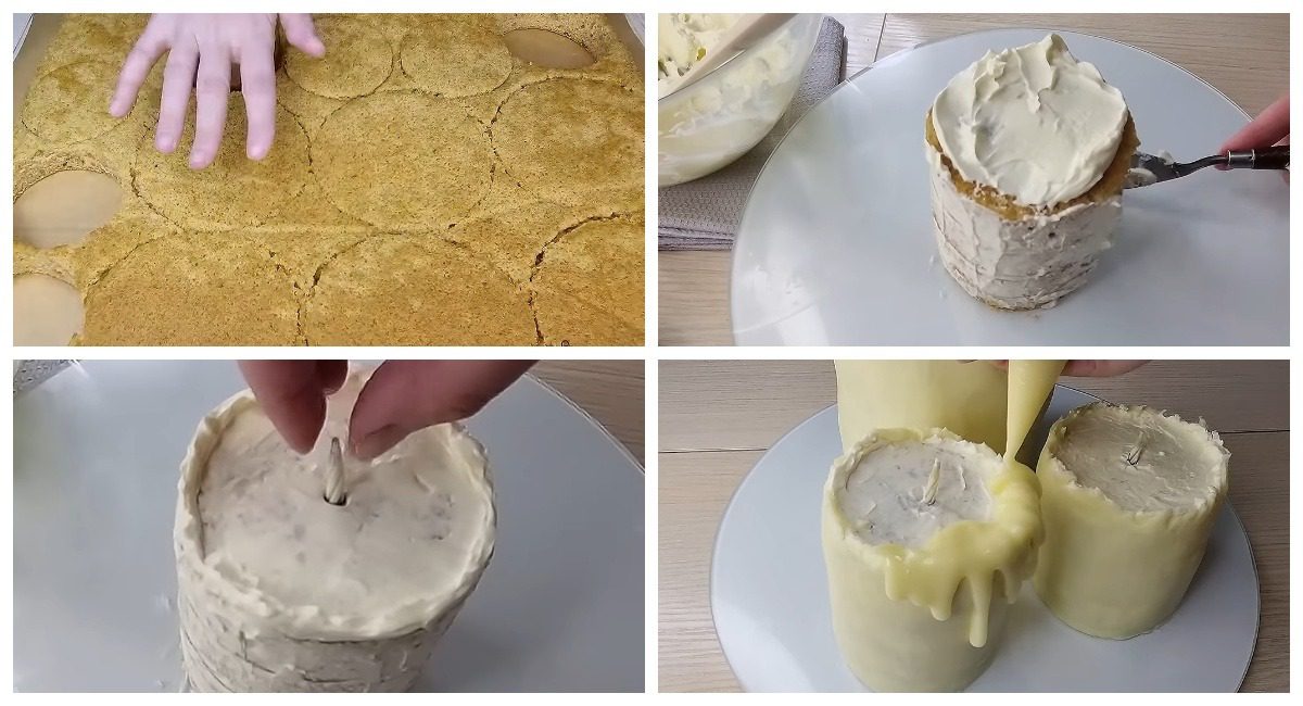 З нарізаних з бісквіта коржів сформуйте циліндри, просочуючи їх та змащуючи кремом. Свічки для торта з нижнього краю обгорніть фольгою та вставте у зроблений у центрі кожного циліндра отвір. Потім ганашем спочатку намастіть циліндри зверху та по боках, а потім за допомогою кулінарного кулька зробіть імітацію воскових напливів.