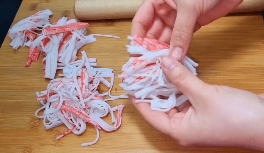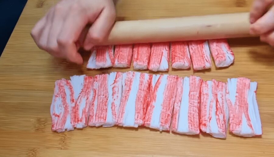 Крабові палички потрібно розірвати на волокна. Зробити це дуже просто, скориставшись одним лайфхаком. Крабові палички викладіть один біля одного і кілька разів пройдіться по них качалкою.