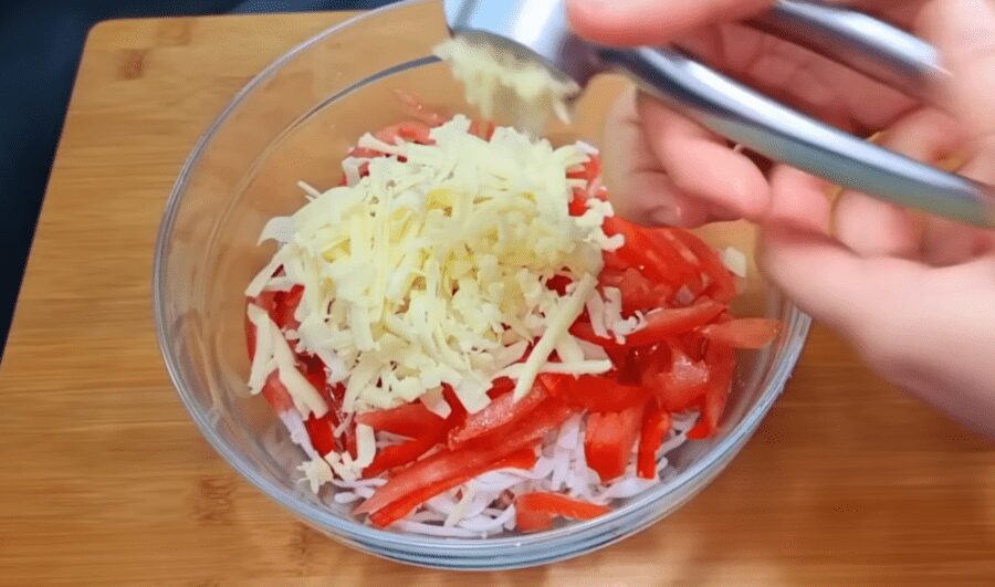 Перекладаємо овочі у салатник. Твердий сир натираємо на крупній тертці і додаємо до інших інгредієнтів. Видавлюємо в салат зубчик часнику, додаємо сіль, перець і заправляємо салат з майонезом.