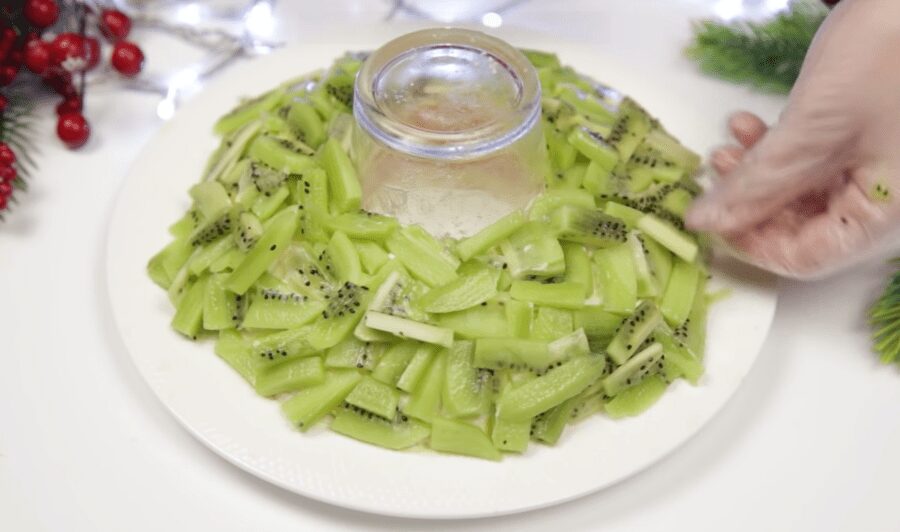 Для фінального шару нарізаємо соломкою ківі. Викладаємо їх на салат, повністю покриваючи всю поверхню.