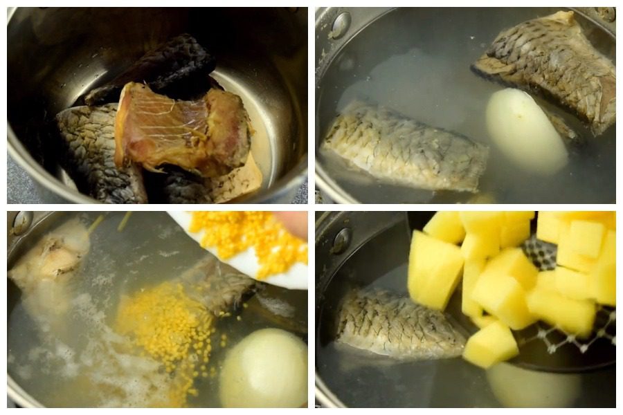 - У каструлю до риби додайте цибулю, картоплю і пшеничну крупу.