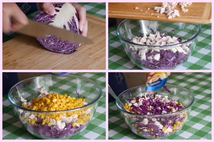 - Дрібно нарізати варене куряче філе і перемістити його до миски з капустою.