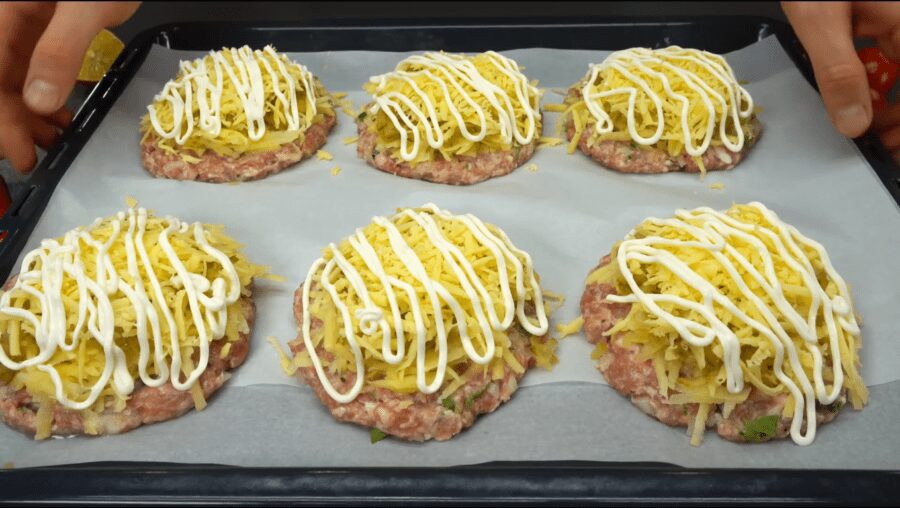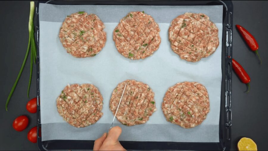 Формуємо крупні фрикадельки і викладаємо на деко, застелене пергаментним папером. За допомогою лопатки з круглих фрикадельок робимо більш плоскі “коржики”.