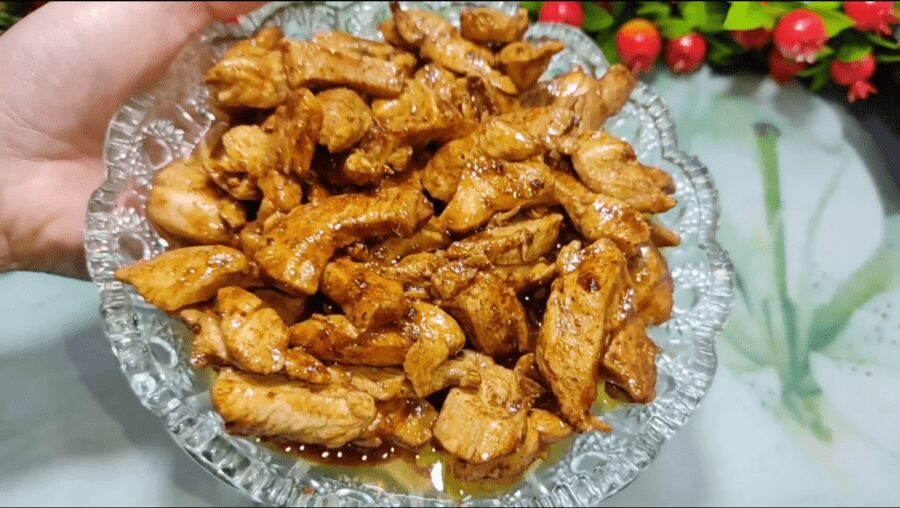 Куряче філе нарізаємо смужками. Обсмажуємо філе на рослинній олії. Коли м’ясо буде напів готовим, вливаємо до нього соєвий соус, додаємо сіль, перець та паприку. Все перемішуємо і обсмажуємо ще 5 хвилин. Курку знімаємо з пательні і даємо повністю охолонути.
