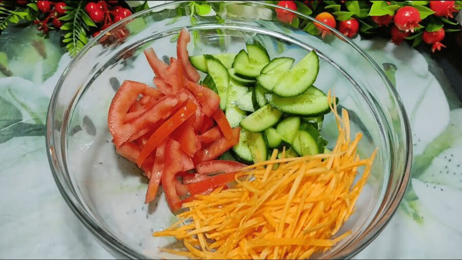 Огірок нарізаємо півкільцями і перекладаємо у салатник. Помідор розрізаємо на 4 частини і вирізаємо серединку (насіння). Філе помідора нарізаємо на смужки і перекладаємо у салатник. 1 морквину натираємо на тертку для корейської моркви і додаємо її в салат.