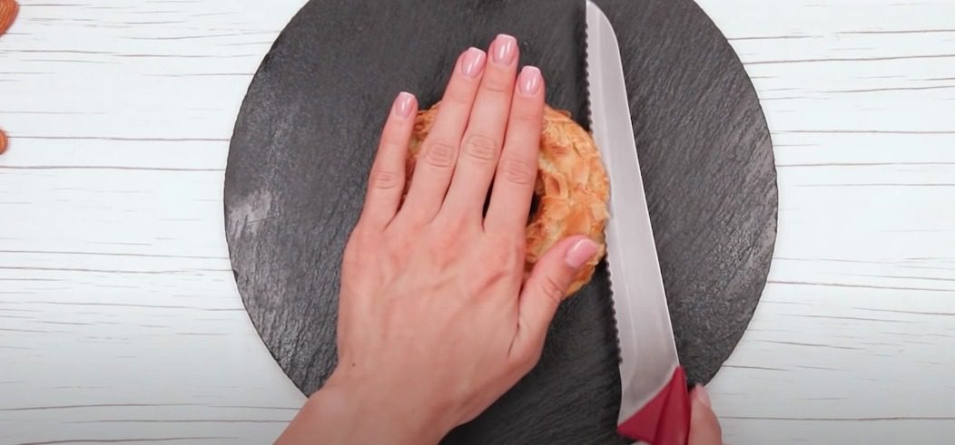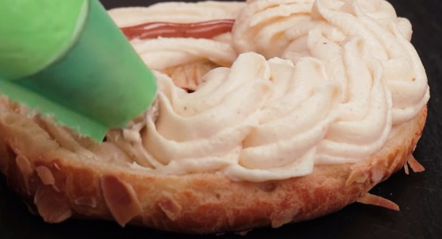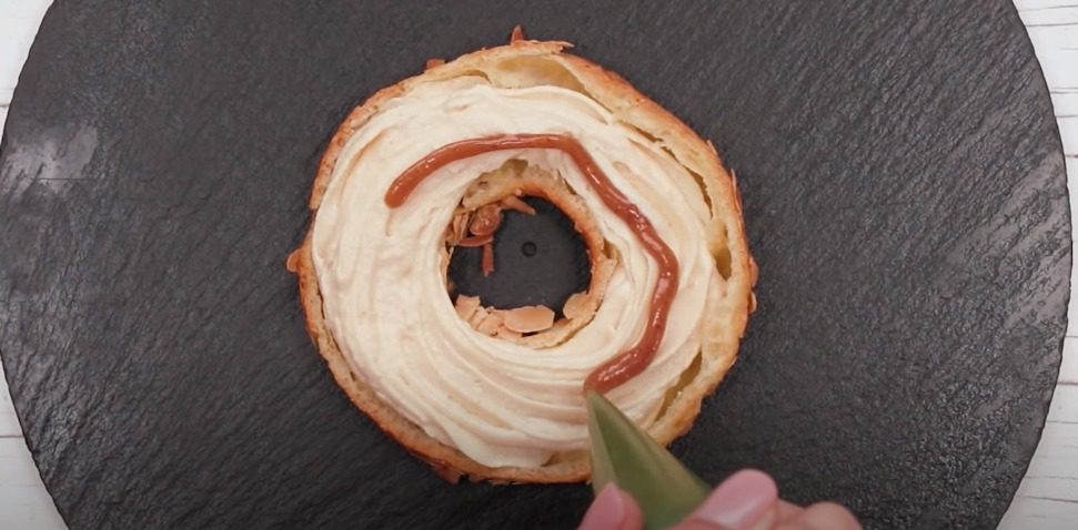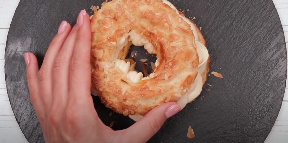 Додайте горіхову масу у вершкове масло й збийте міксером. Викладіть на тарілку нижню частину колеса з заварного тіста. З кулінарного шприца вичавіть по колу крем. Зверху зробіть тоненьку цівочку горіхової суміші. Знову додайте крем. Накрийте верхньою частиною і присипте цукровою пудрою.