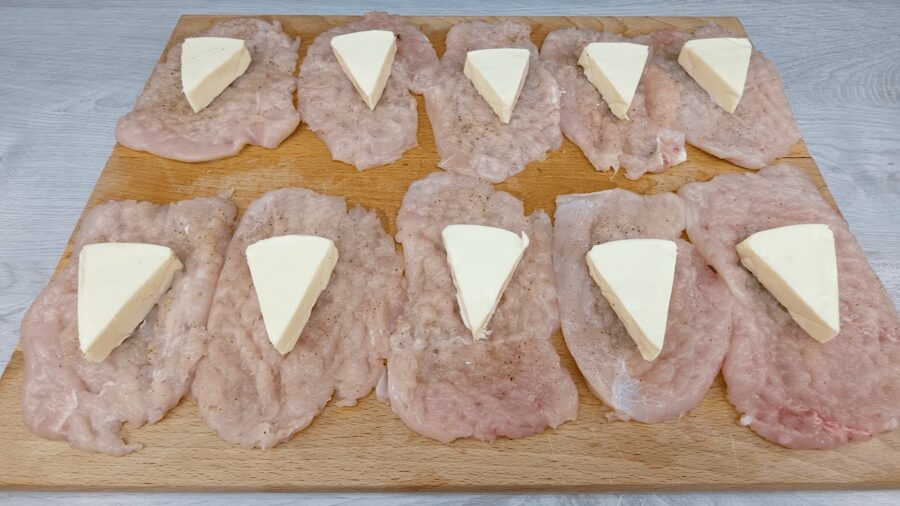 Беремо м’який плавлений сир у трикутничках. Беремо стільки трикутничків, скільки у вас вийшло шматочків м’яса. Сир викладаємо на центр кожного м’ясного шматочка.