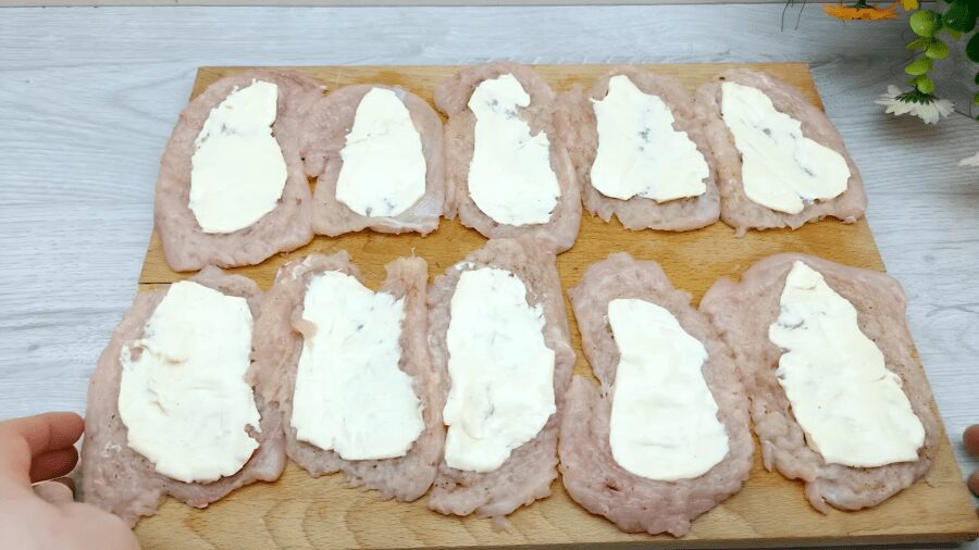 Качалку змащуємо рослинною олією і розкачуємо сир по всій довжині відбитого м’яса.