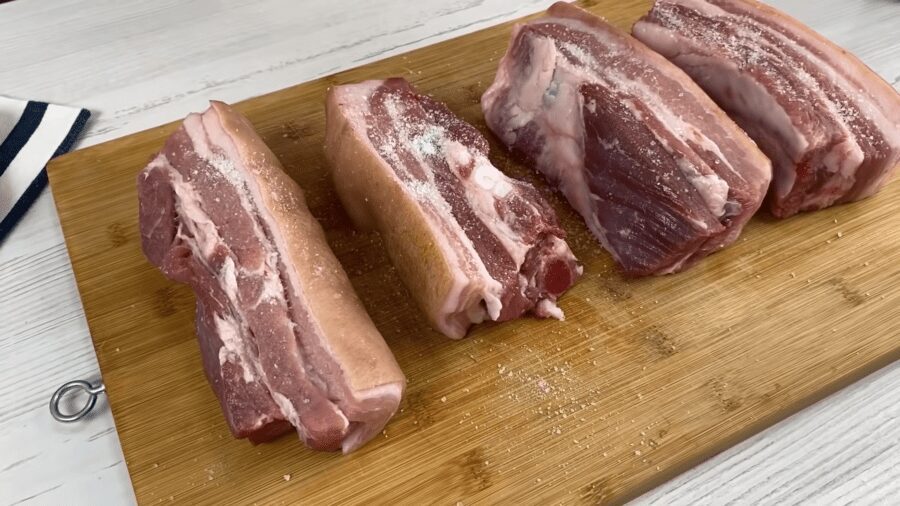 Свинячу грудинку нарізаємо на бруски вагою приблизно 0,5 кг. М’ясо зі всіх сторін натираємо сіллю і перцем.