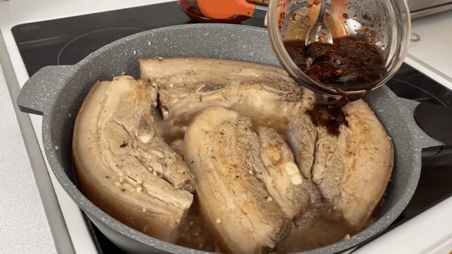 Відкриваємо кришку сковорідки, перевертаємо м’ясо на інший бік і заливаємо соєвий соус зі спеціями.