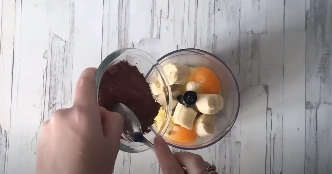 Банани мають бути не перезрілими, але й не зеленими. Обирайте з жовтою шкірочкою без коричневих плям. Яйця беріть великі. Якщо менші, то додайте 3 штуки. Банани позбавте шкуринки й поламайте на невеликі шматочки. Перекладіть у чашу блендера, розбивши туди яйця, всипавши какао й розпушувач.