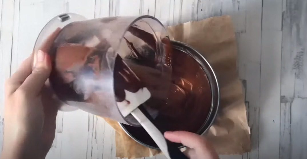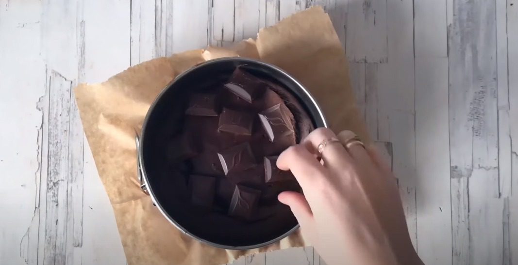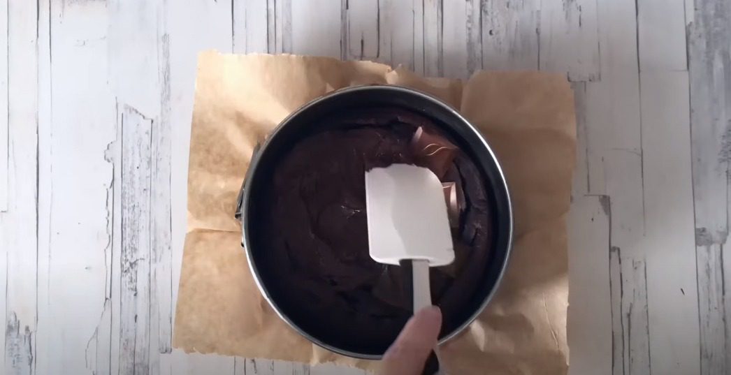Подрібніть суміш, щоб стала однорідною, а яйця добренько збилися. Форму 14-16 см у діаметрі вистеліть пергаментом. Перелийте готову шоколадну масу туди. Духовку попередньо розігрійте до 170 градусів. Якщо у вас форма скляна, то витягніть із духовки решітку. Закладайте разом із формою, щоб вони були однієї температури.