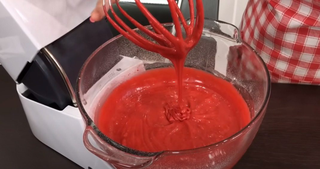 В середині процесу підлийте ванільний екстракт. До масляної суміші додайте яйце. Знову збийте. Таким же чином вмішайте й решту яєць. Влийте олію і знову збийте. До пахти додайте фарбник. Перемішайте.