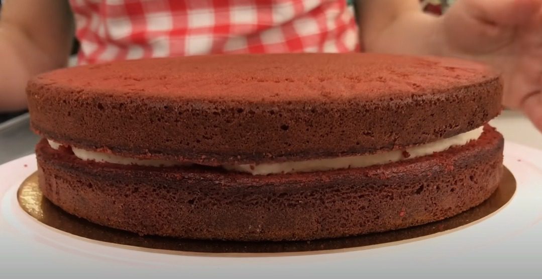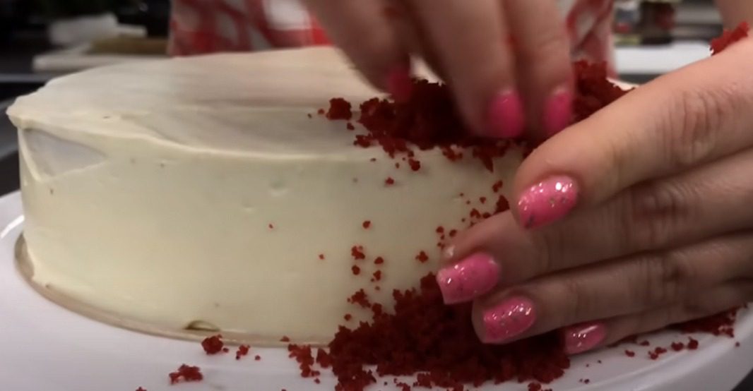 Дістаньте коржі з холодильника. Підрівняйте краї, перетворивши обрізки на крихту для прикрашання торта. Коржі змащуйте кремом і викладайте один на один. Змастіть торт “Червоний оксамит” зверху та з боків. Присипте крихтою. Прикрасьте на власний смак. А якщо не хочете возитися з випіканням коржів, спробуйте такий рецепт: