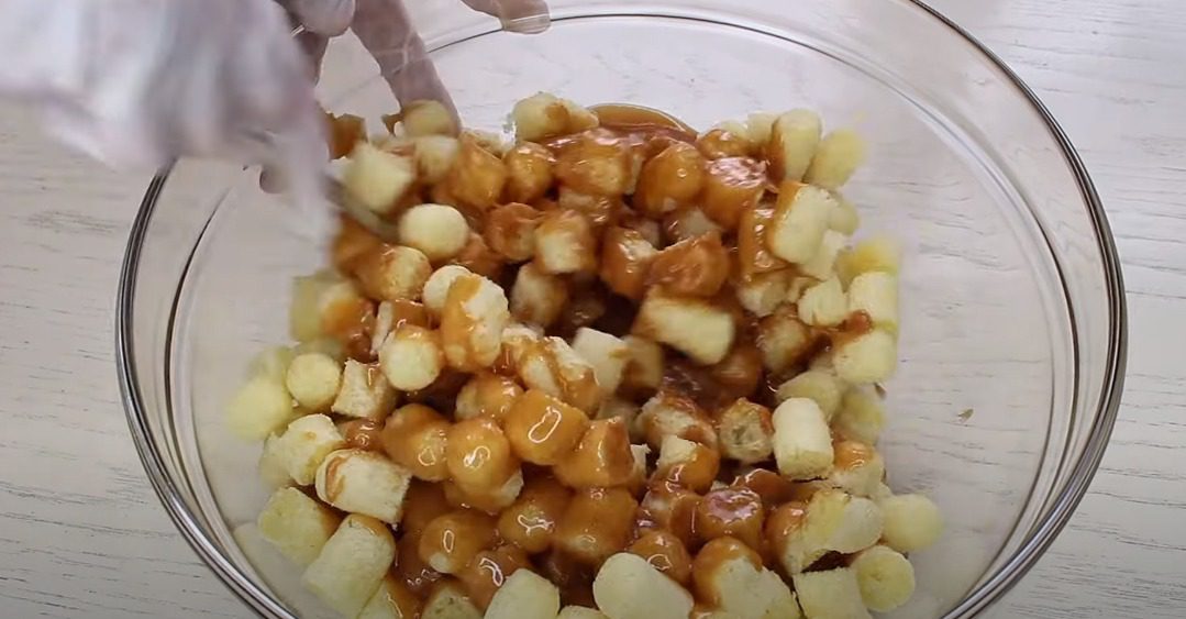 Для крему розм’якле вершкове масло збийте вінчиком, щоб побіліло. Потроху в процесі збивання додавайте варену згущівку. Коли випічка прохолоне, покришіть її у глибоку миску. Додайте крем і перемішайте.