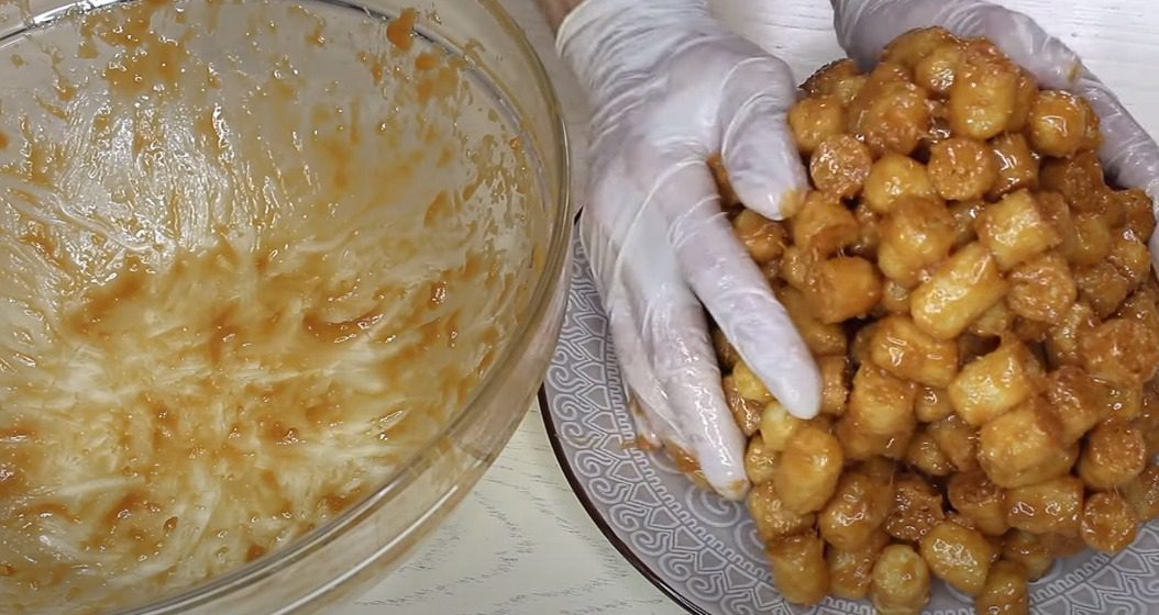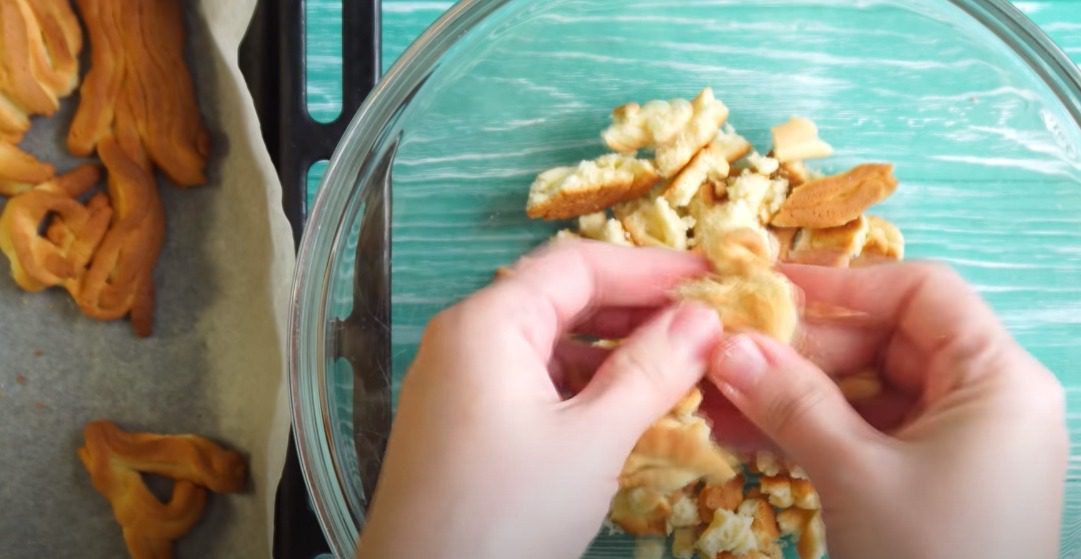 Невеликими шматочками пропускайте тісто крізь м’ясорубку. Можете зняти з неї ніж. Викладайте його на деко, вистелене пергаментом. Випікайте у духовці, розігрітій до 200 градусів близько 20 хвилин.
