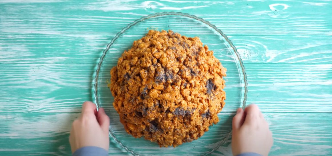 Відразу ж викладіть на блюдо й сформуйте мурашник. Зверху присипте маком. Поставте в холодильник. Дайте настоятися 3 години. Після чого можете нарізати на порції.