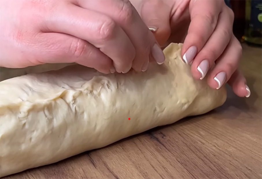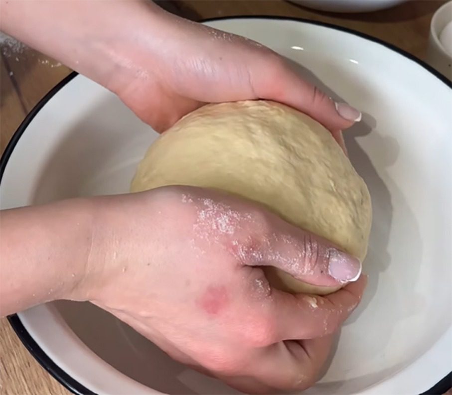 Коли маса стане густою, починайте замішувати руками. В процесі влийте олію. Так тісто стане еластичним й не липнутиме до рук. Накрийте готовий ковбик рушником і дайте настоятися пів години обов’язково у теплому місці.