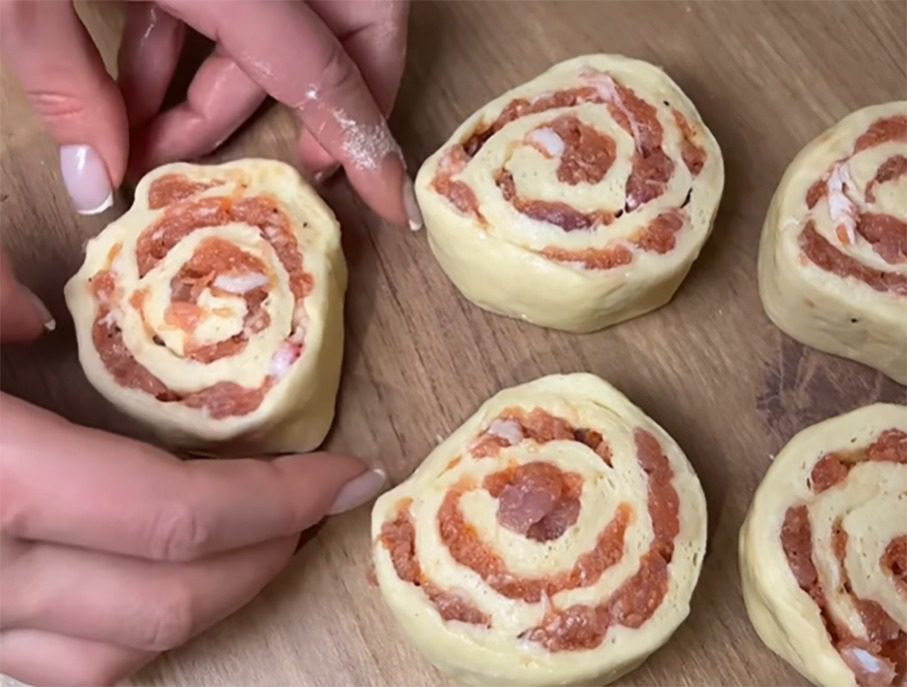 До прохололої грибної підливи влийте сметану й перемішайте. Коли тісто достатньо підійде, розкачайте його пластом завтовшки в 1 см. Розріжте навпіл. На кожну половинку викладіть фарш по всій поверхні. Скрутіть рулет. Добренько защипніть шов. Наріжте рулет на шматочки.