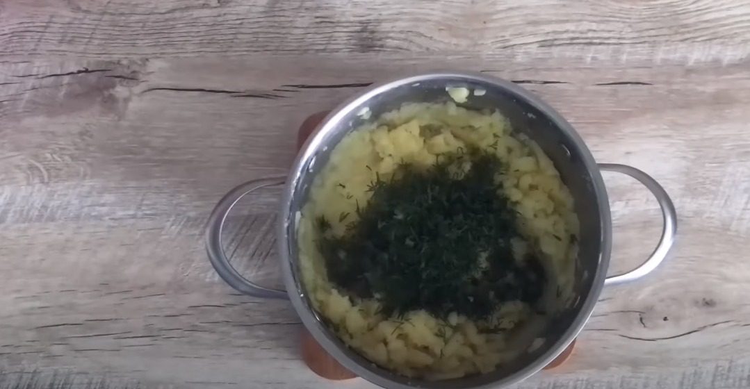 Обчищену картоплю наріжте кубиками. Картоплю відваріть у підсоленій воді до готовності. Воду злийте, а овоч перетріть на пюре. Кріп вимийте, стряхніть від крапель вологи, дрібно наріжте. Додайте вершкове масло та кріп.