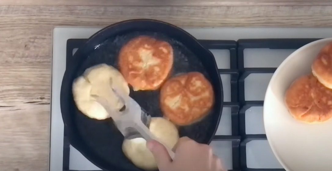 У пательні розігрійте олію, яка має повністю покрити дно. Обсмажте біляші на середньому вогні з одного боку. Коли з’явиться рум’яна скоринка, переверніть і підсмажте до готовності.