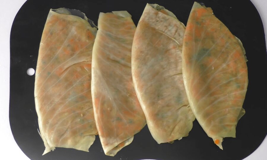 З качана капусти знімаємо капустні листи і відварюємо у підсоленій воді 3-5 хвилин. Зрізаємо тверду частину і злегка відбиваємо лист молотком для м’яса. Якщо капуста молода, це робити не потрібно. На одну частину капусти викладаємо трохи начинки і розмащуємо по листі. Закриваємо начинку іншою частиною капустного листа. Притискаємо краї.