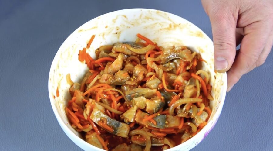 4. Додати гірчицю та кетчуп, після чого ретельно перемішати всі інгредієнти, щоб оселедець рівномірно покрився маринадом.