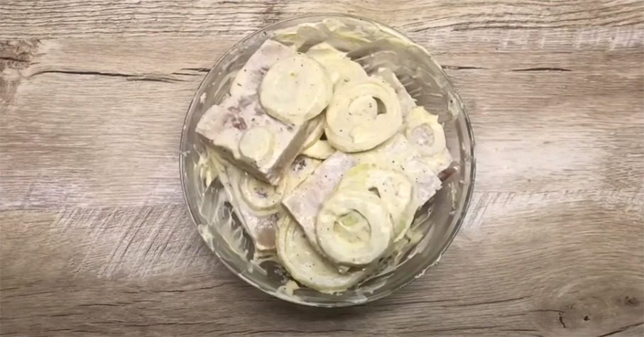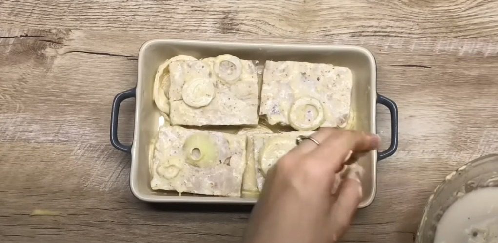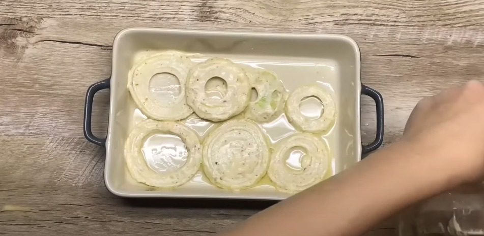 В окремій мисочці змішайте цибулю, сметану чи майонез, рибні спеції. Додайте сіль, поперчіть. В цю суміш перекладіть рибу й залиште на 20 хвилин у холодильнику, щоб промаринувалася. Форму змастіть олією. Викладіть цибулю.
