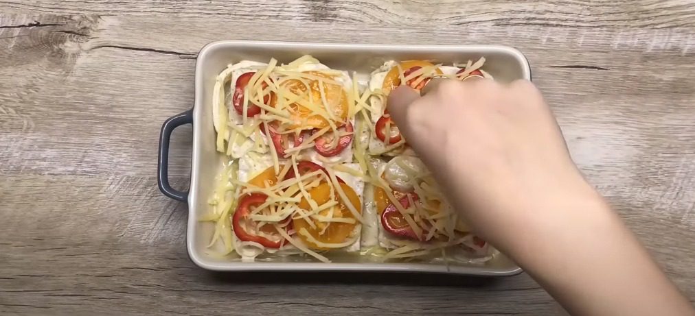Перекладіть туди ж шматочки риби разом із маринадом. Далі повинні бути болгарський перець, помідори та тертий сир. Поставте у розігріту до 200 градусів духовку на 30 хвилин. Перед подачею готову страву прикрасьте подрібненою зеленню.