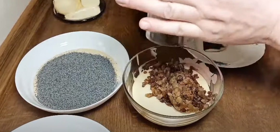 В одну мисочку додайте родзинки, у другу подрібнені волоські горіхи, в третю – мак. Кожну суміш розмішайте окремо. Візьміть деко 20х30 см, вистеліть пергаментним папером.