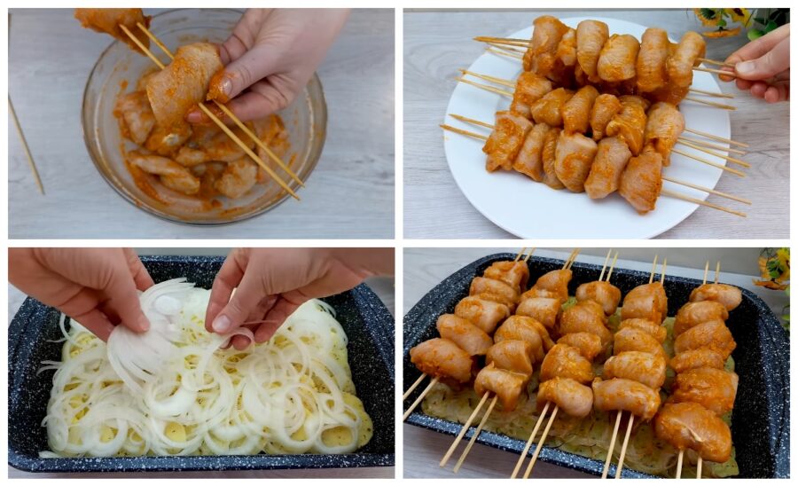 - Після маринування шматки курятини нанизуйте на шпажки так, як на фото. У вас повинно вийти 5 штук таких “шашличків”.