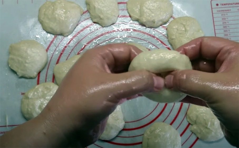 Розділіть готове тісто на однакові шматочки. Скачайте з них кульки. В середині зробіть отвори, щоб вийшли пончики. Викладіть на пергамент, змащений олією. Так вони не втратять форми, коли будете перекладати їх у фритюр. Залиште на 15 хвилин, щоб заготовляння підійшли.
