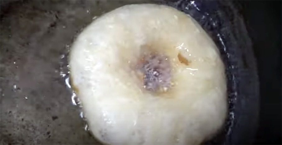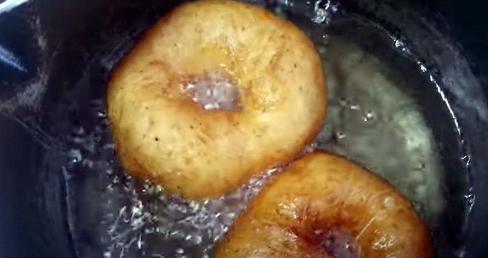 Поставте на вогонь пательню з високими бортиками. Влийте олію. Вона має покривати дно на 2 см. Викладіть пончики, скільки влізе, і смажте близько 7 хвилин з одного боку, допоки не зарум’яняться.