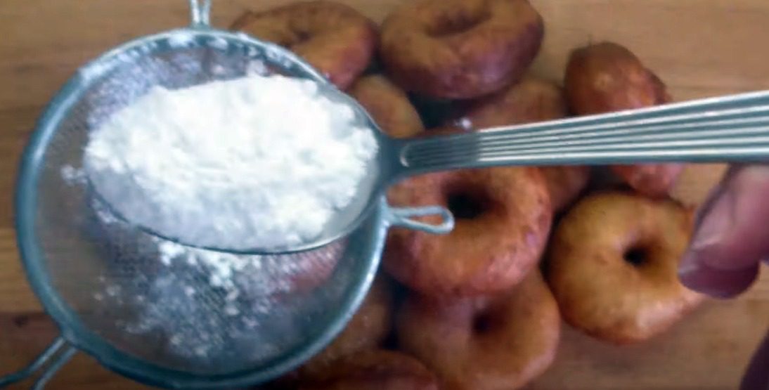 Тримайте на середньому вогні. Переверніть і підсмажте ще 5 хвилин. Викладайте на паперовий рушник. Коли пончики прохолонуть, присипте їх цукровою пудрою.