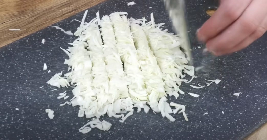 Капусту й моркву вимийте, почистьте й ще раз вимийте. В капусти зніміть верхні листочки. Решту пошинкуйте ножем тоненько. Щоб овоч був якомога дрібніший, ще й впоперек соломки зробіть надрізи в кількох місцях. У моркви зніміть шкірочку овочерізкою. Пошинкуйте овоч соломкою, а потім поріжте вздовж – теж подрібніть.